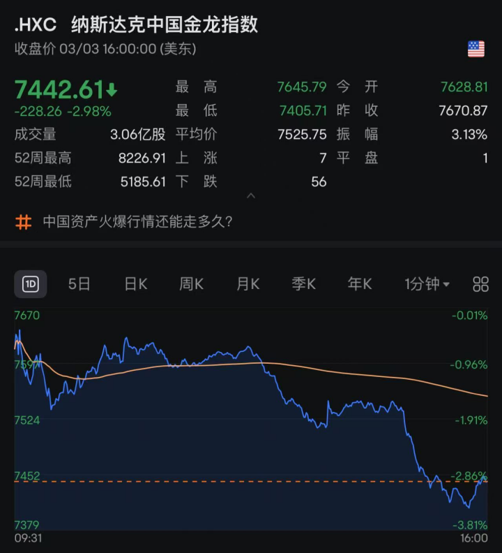 当地时间3月3日,美股三大指数高开低走,其中纳指跌幅超过2%。截至收盘,道指跌1.48%,纳指跌2.64%,标普500指数1.76%。