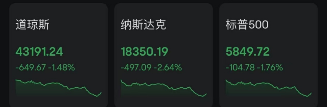 当日,美股市场恐慌情绪升高,三大指数高开低走,其中纳指跌幅超过2%。截至收盘,道指跌649.67点,跌幅1.48%,报43191.24点;纳指跌497.09点,跌幅2.64%,报18350.19点;标普500指数跌104.78点,跌幅1.76%,报5849.72点。
