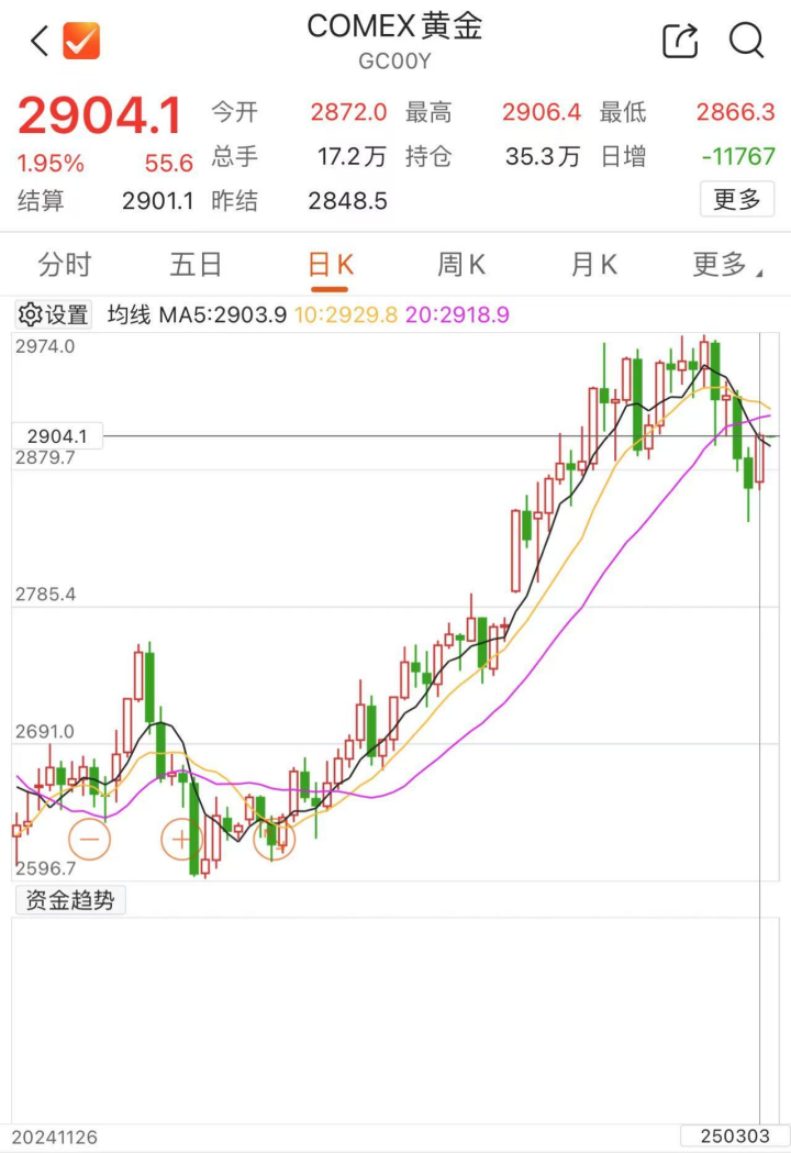 美国对加拿大加征关税将落地,市场避险情绪明显升温,贵金属市场再度走强。当地时间3月3日,COMEX黄金期货收涨1.95%,报2904.1美元/盎司;COMEX白银期货收涨2.44%,报32.265美元/盎司。